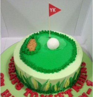 A unique birthday cake for golf lovers. This green cake resembles a golf course, complete with a fondant golf ball, tiny flags and fondant grass on the side. The vibrant green mimics the grass while the textured detail creates a realistic landscape.
