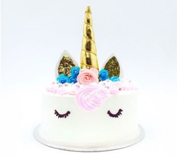 It doesn’t get more unique than this. Our unicorn cake is a one tier piece that looks like a unicorn. It has a cream base to give it that white coat, a horn made from fabric and some toppers for ears.