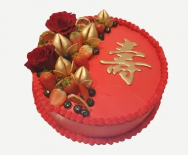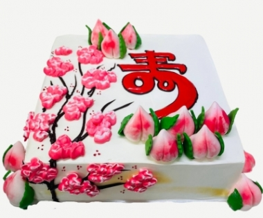 A longevity cake is a symbolic birthday cake commonly used in Chinese culture to celebrate milestone ages like 60, 70, 80 and above. It often features traditional motifs such as peaches (shou tao), cranes, and Chinese calligraphy representing long life.