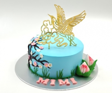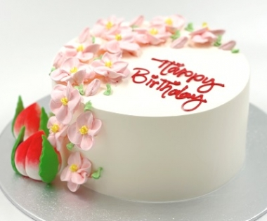 Celebrate timeless beauty and blessings with this floral-inspired cake. Blush pink and white cherry blossoms, watercolour accents, and symbolic Shou Taos make it a stunning choice for milestone birthdays.