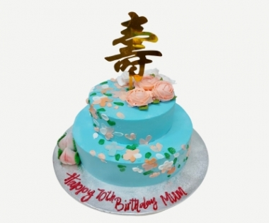 A contemporary twist on a traditional favourite, this calming blue two-tier cake features oil-painting style florals, delicate hand-piped buds, icing peaches, and a luxurious gold acrylic “寿” topper for a truly refined look.