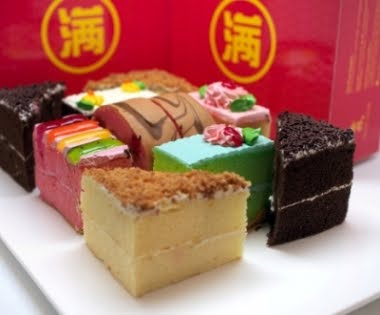 This baby full month cake set combines five mini assorted cakes with two red eggs and two traditional sweets – Ang Yi for boys or Ang Ku Kueh for girls.